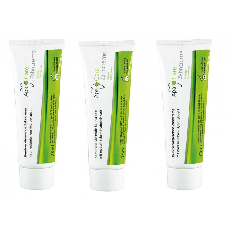 La pasta de dientes remineralizante ApaCare contiene fluoruro de sodio (1.450 ppm de ion flúor) y esmalte líquido (hidroxiapatita médica). Este mineral altamente activo se adhiere y se incrusta en