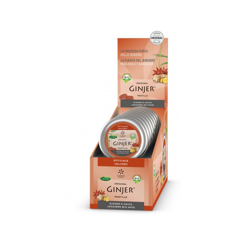 Pastillas de jengibre hechas con jugo de acacia y con sabor a limón. *Ingredientes procedentes de agricultura ecológica. Puede contener trazas de frutos secos.LINEA GINJER DE LEMONPHARMA El jengibre se ha utilizado durante miles de años como una planta curativa natural. Se conoce como uno de los alimentos más saludables del mundo. El jengibre más utilizado es el Zingiber o³cinalis. Sus raíces contienen un espeso bálsamo rico en aceites esenciales y los ingredientes picantes gingeroles y shogaoles. Se dice que estos elementos tienen un efecto antioxidante, antiinflamatorio TRÍO JENGIBRE ECOLÓGICO POR CONVICCIÓN |